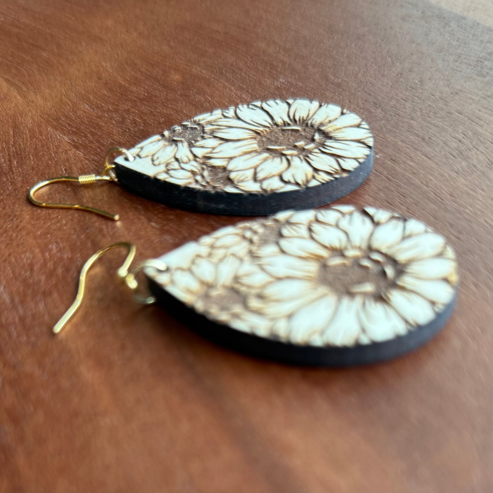 Sunflower teardrops engraved on maple.